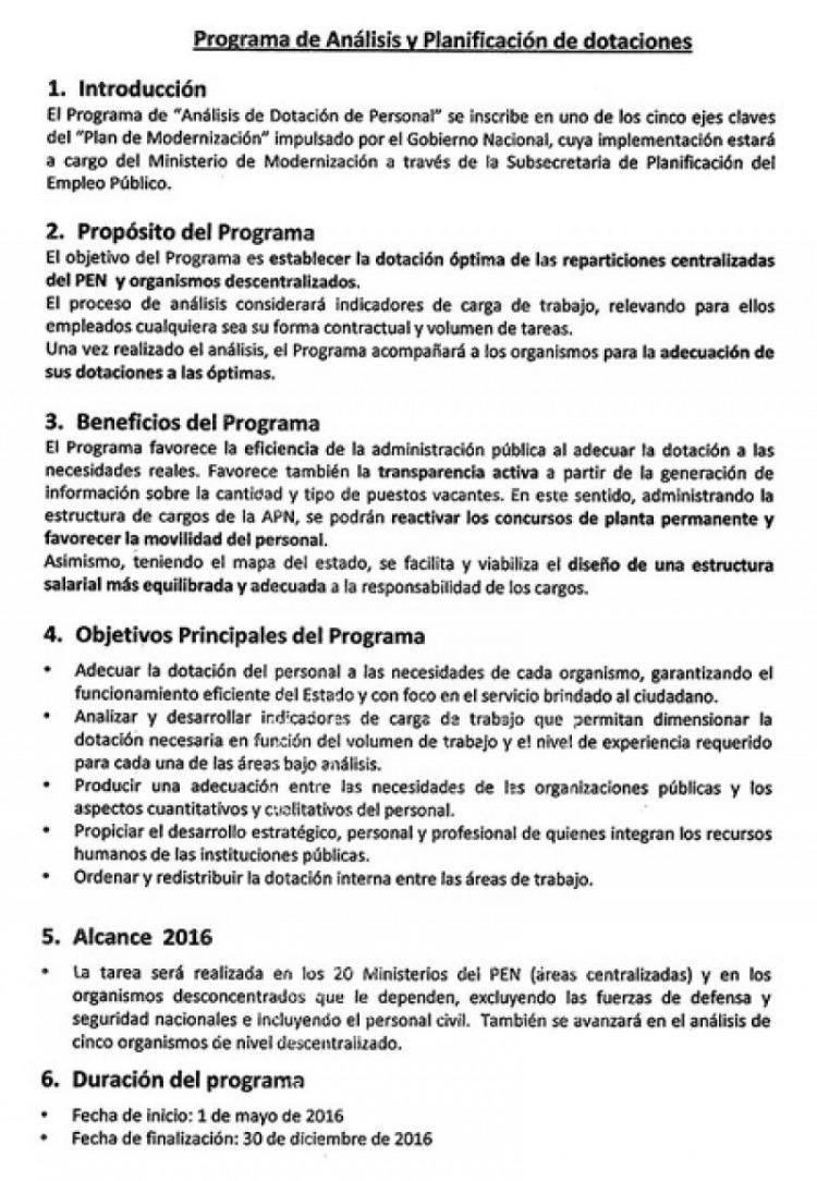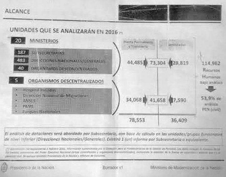 El escrito fue girado a las direcciones de recursos humanos de los 20 ministerios y de cinco organismos descentralizados que forman parte del Poder Ejecutivo. Página 12 tuvo acceso a esa directiva en la que se propone una serie de metas y pasos a seguir para que cada organismo pueda adecuar su "dotación inicial" de trabajadores y llevarla a una "dotación óptima". Según define el Ministerio de Modernización, el objetivo es arribar a “la cantidad de recursos humanos para hacer frente a los volúmenes de trabajo de cada uno de los organismos”.