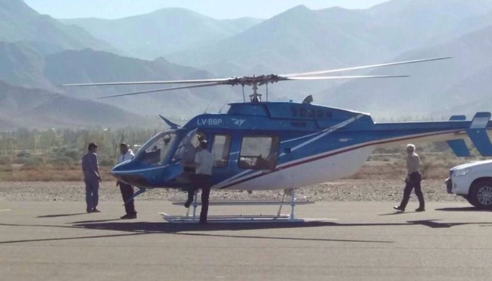 El helicóptero de Defensa Civil aguardaba a la comisión policial con el montañista herido y su compañero, en la ladera de uno de los cerros denominada Las Cuevas para llevarlos a la ciudad de Cachi.