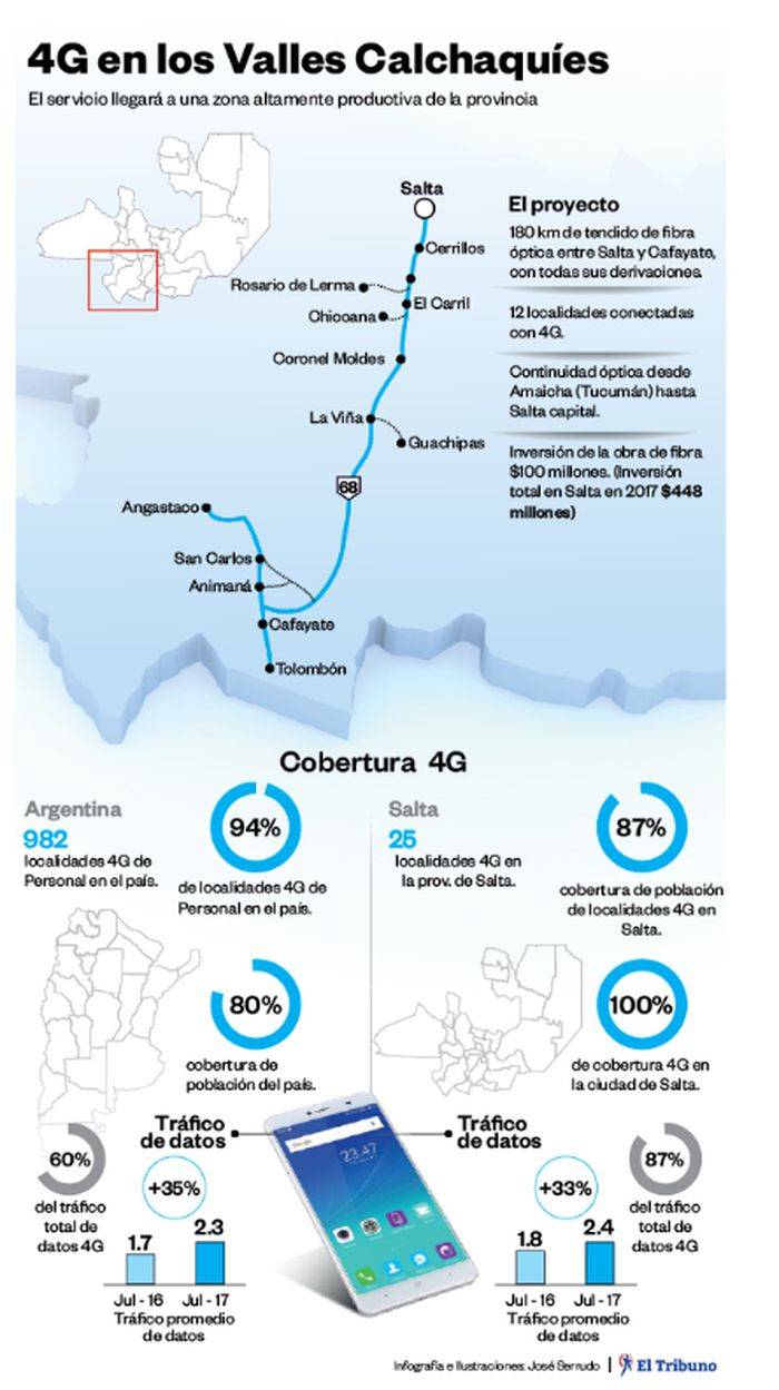 Tecnología27/09/2017Desde hoy, la totalidad del Valle Calchaquí contará con internet de alta velocidad a través del servicio 4G de telefonía móvil, con la puesta en funcionamiento de una línea de fibra óptica que conecta a ese sector de la provincia con la red nacional, confirmó El Tribuno.