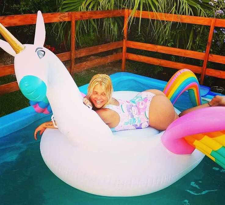 Con una malla enteriza súper cavada y arriba de un inflable en la pileta, la actriz provocó y fue por más.