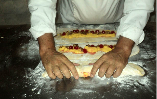 6. Decorar con crema pastelera y pintar (con el huevo que quedó) las partes en donde no haya crema pastelera.