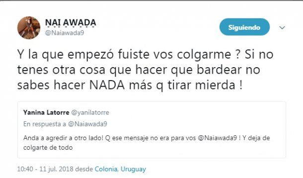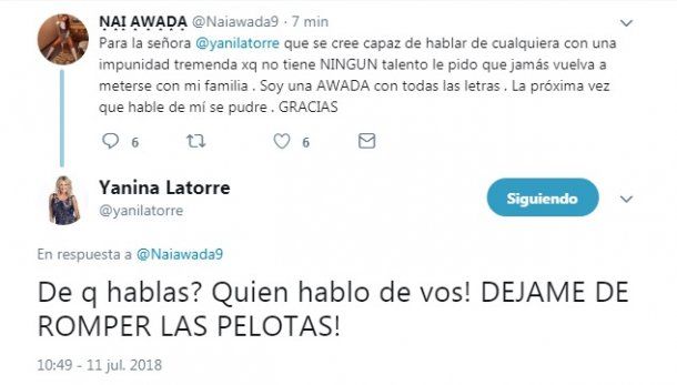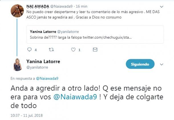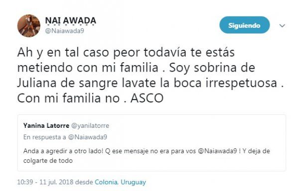 Si bien Latorre le aclaró que el tuit no era dirigido a ella, le recomendó que “dejara de colgarse” de las situaciones y Nai explotó con una catarata de mensajes: “En tal caso te estas metiendo con mi familia. Soy sobrina de Juliana de sangre, lávate la boca irrespetuosa. Con mi familia no. Asco”.