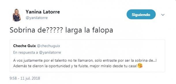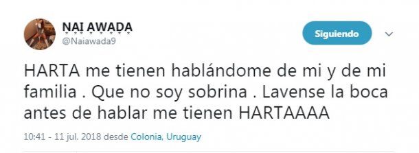 “Y la que empezó fuiste vos. ¿Colgarme? Si no tenés otra cosa que hacer que bardear, no sabes hacer nada más que tirar mierda” y “Harta me tienen hablándome de mi y de mi familia, que no soy sobrina. Lávense la boca antes de hablar, me tiene harta”, fueron otros dos tuits.