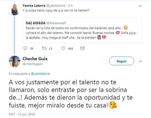 Todo comenzó debido al enojo de Awada por no estar en la lista de convocados al Bailando 2018 y que en su lugar sí figuren personajes como Jujuy Giménez, ex pareja del Pelado López. Luego de que Yanina saltara a defender a la modelo, una usuaria arremetió contra Nai: “A vos justamente por el talento no te llamaron. Solo entraste por ser la sobrina de…”, indicaba parte del tuit que, en vez de ser respuesta al de Nai, lo fue al de Yanina.
