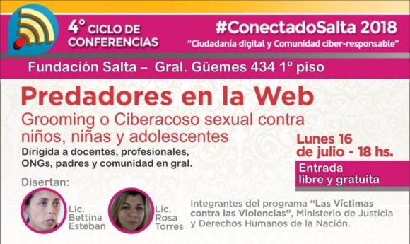 La charla, denominada “Predadores en la web: grooming o ciberacoso contra niños, niñas y adolescentes”, tendrá lugar el 16 de julio, a las 18hs., en la Fundación Salta, 1º Piso (Gral. Güemes 434). Será con entrada libre y gratuita, hasta completar capacidad de la sala El ingreso será a partir de horas 17.30.