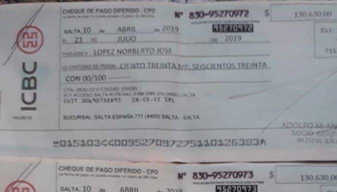 "Fuimos a Salta y no pudimos encontrar quién quiera recibir un cheque de Incovi, lo peor será que el cheque no llegue tener fondos cuando se vaya a cambiar en septiembre, porque ya tuvimos esa mala experiencia de recibir cheques y cambiarlos en cambistas que cobran su comisión. Luego se toparon con el problema de que no tenían fondos y estamos sospechando que es muy posible que con este cheque pase lo mismo", alertó.
