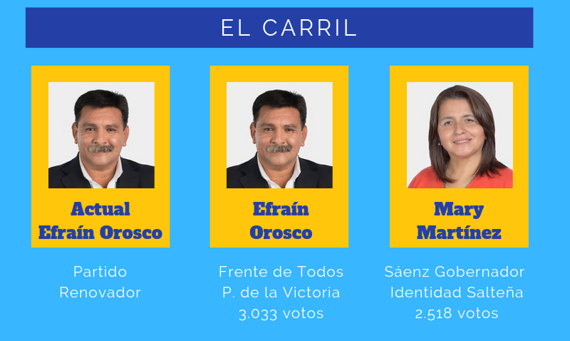 Efraín Orosco, en El Carril, se quedó con 3033 votos, ganándole a la diputada Mary Martínez del frente Sáenz Gobernador, quien obtuvo un total de 2518.