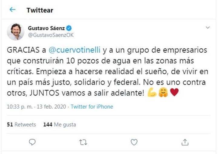 "GRACIAS a @cuervotinelli y a un grupo de empresarios que construirán 10 pozos de agua en las zonas más críticas. Empieza a hacerse realidad el sueño, de vivir en un país más justo, solidario y federal. No es uno contra otros, JUNTOS vamos a salir adelante!", estableció el tuit.