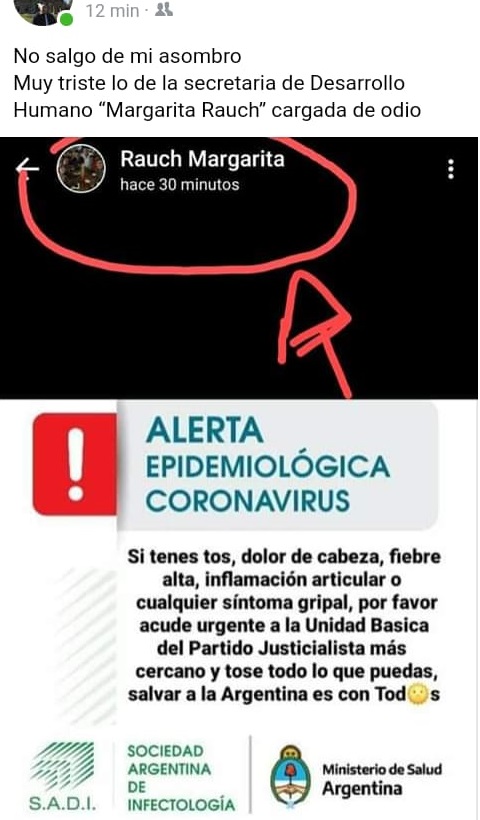 En las últimas horas se generó cierto revuelo en la localidad de Tartagal, a raíz de un posteo que circuló en las redes sociales, donde se señalaba a una funcionaria de la Municipalidad como autora de un comentario donde se usaba al coronavirus, como incitación a contagiar a miembros de un partido político. Esta acción fue desmentida rotundamente por la funcionaria.