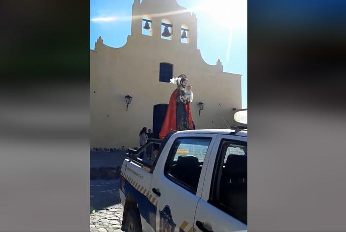 Ahora, la imagen del santo fue sacada en procesión desde la icónica iglesia ubicada frente a la plaza principal de Cachi, donde con la ayuda de la Policía fue colocada en un patrullero. Lo mismo hicieron con una réplica de la Virgen del Milagro.