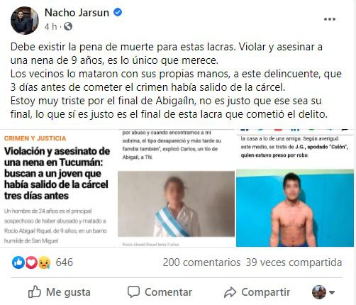 En Salta, el diputado provincial Ignacio "Nacho" Jarsún, revolucionó las redes sociales con una reflexión sobre lo que sucedió. “Debe existir la pena de muerte para estas lacras. Violar y asesinar a una nena de 9 años, es lo único que merece”, escribió en sus cuentas de Facebook e Instagram.