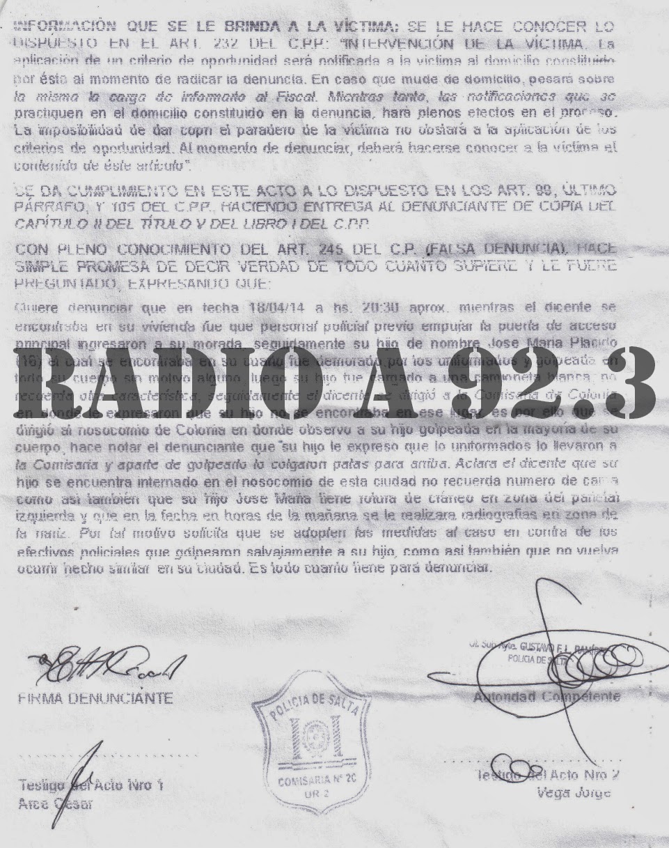 Policiales22/04/2014La caratula inicial que recibió el hecho fue el de "Lesiones", interviniendo la Fiscalía Nº 1 de Orán. Todo sucedió, según lo expresado en la denuncia, el pasado viernes en horas de la noche cuando en el domicilio de la familia Plácido ubicado en Barrio Los Jesuitas, calle San Cayetano al 10, los uniformados entraron en la vivienda tras empujar la puerta de acceso principal y se llevaron a José María Plácido, un joven de 16 años, que en ese momento estaba dentro de su habitación.