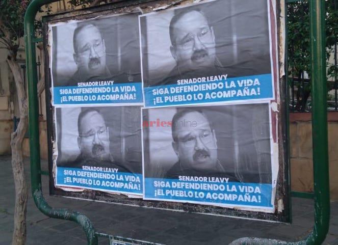 Ahora y según reporta FM Aries, las calles de la ciudad de Salta han amanecido con afiches en varias parte del microcentro, donde se le pide al senador que reafirme su voto negativo hacia el aborto. “Senador Leavy siga defendiendo la vida, ¡el pueblo lo acompaña!” reza el texto sobre un marco azul que acompaña la foto del legislador oficialista.