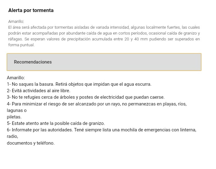 El Servicio Meteorológico Nacional emitió un alerta amarilla para Salta. La zona cordillerana y los valles Calchaquíes en la provincia están siendo afectadas por tormentas aisladas algunas localmente fuertes se espera esto siga durante esta noche. Precaución por deslizamientos de tierra y crecidas de ríos.