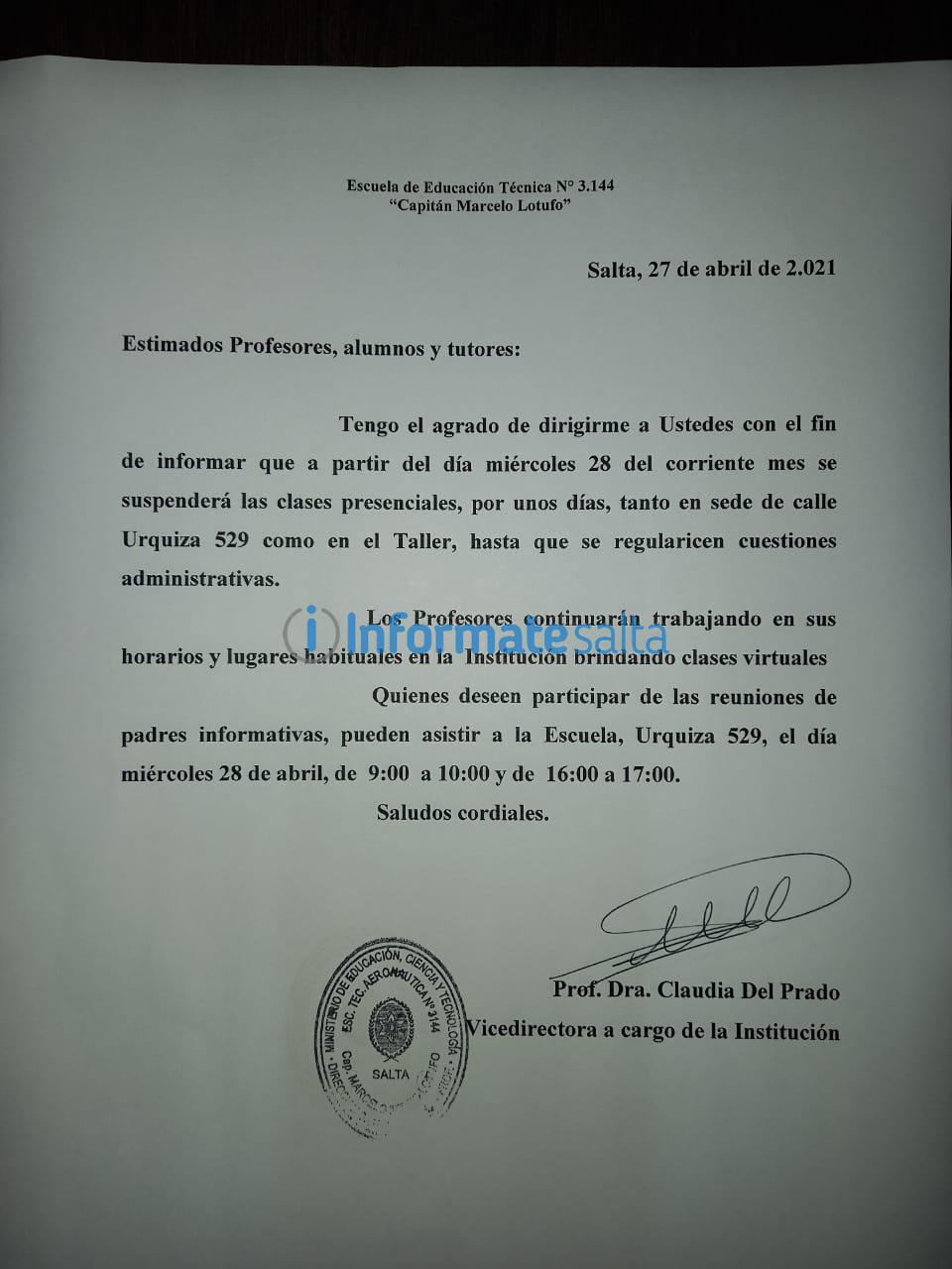 Según pudo saber InformateSalta, se trataría de una situación irregular con los fondos de la institución. Sin embargo, genera duda porque por razones administrativas se decidió suspender la presencialidad de los alumnos, dejando que todas las actividades académicas se desarrollen de manera virtual.