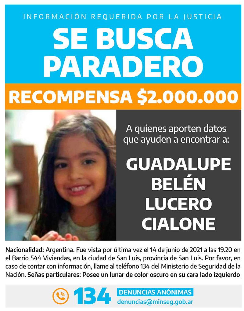 El Gobierno decidió ofrecer una recompensa de 2 millones de pesos para quien aporte información que ayude a encontrar a Guadalupe Belén Lucero.