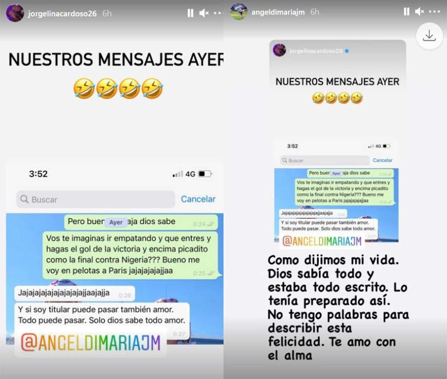 Jorgelina Cardoso compartió en sus historias de Instagram la captura de un chat con su marido donde se puede leer una suposición que hace ella sobre el desempeño que puede llegar a tener él durante el partido en el Maracaná: “¿Vos te imaginás ir empatando y que entres y hagas el gol de la victoria y encima picadito como la final contra Nigeria?”. Acto seguido, y para apostar algo, Cardoso hizo una promesa por si algo así llegaba a pasar y con mucho humor le expresó: “Me voy en pelotas a París”.