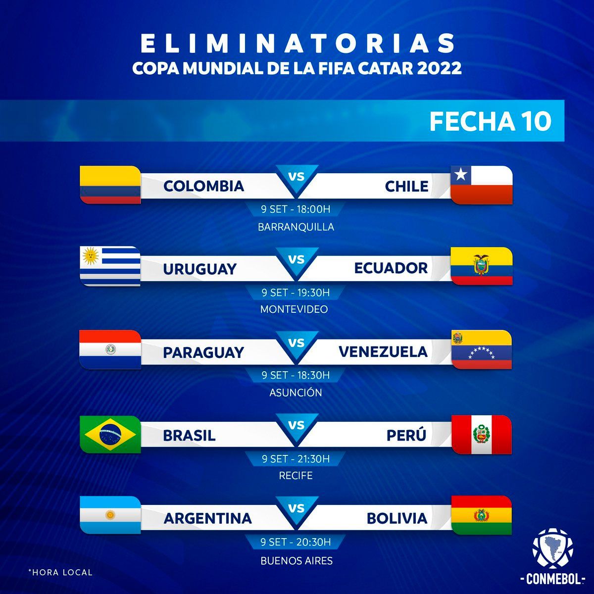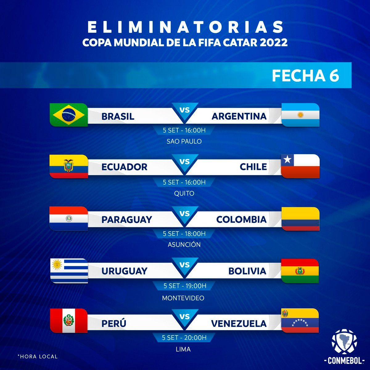 La Conmebol confirmó hoy las fechas y horarios correspondientes de la triple jornada de Eliminatorias Sudamericanas a disputarse del 2 al 9 de septiembre en la reanudación del certamen que otorga cuatro plazas y un repechaje para el Mundial Qatar 2022.