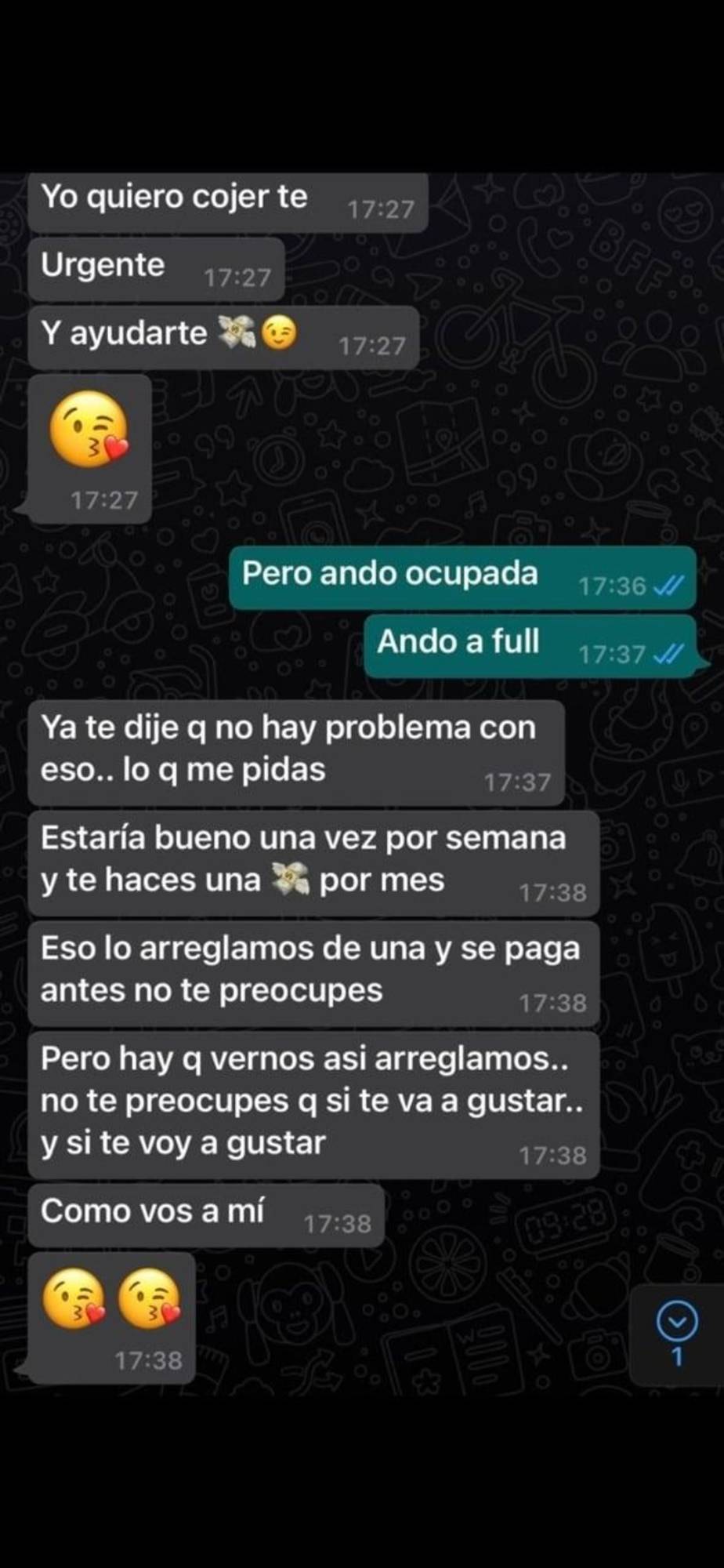 Además, la mujer presentó varias capturas de pantalla, donde se puede leer una propuesta para mantener relaciones sexuales. En una de las capturas de pantalla se lee: "Estaría bueno una vez por semana y te haces una (emoji de dinero) por mes". En otro texto se lee: "Pero hay que vernos así arreglamos, no te preocupes que sí te va a gustar y sí te voy a gustar" y luego le envió una foto de sus genitales.