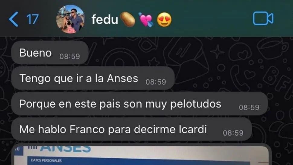 "Bueno, tengo que ir a la Anses porque en este país son muy pelot... Me habló Franco (su amigo) para decirme Icardi. Me casaron a mí con su novia. El pelot.. que lo tenía que editar en la Anses en realidad", le comentó el joven a su pareja por WhatsApp y la captura de pantalla de la conversación es furor. "Porque yo leí lo que firmé esa parte estuvo toda bien, soy el testigo", agregó.