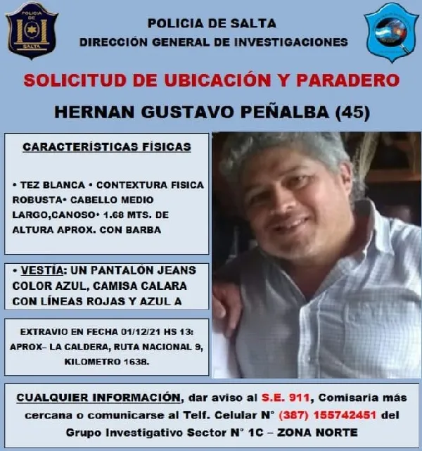 Cabe recordar que Peñalba había sido visto por última vez cerca del mediodía del miércoles por ruta nacional 9, en el kilómetro 1638 de La Caldera, vistiendo camisa clara con líneas rojas y azules, pantalón jeans azul.