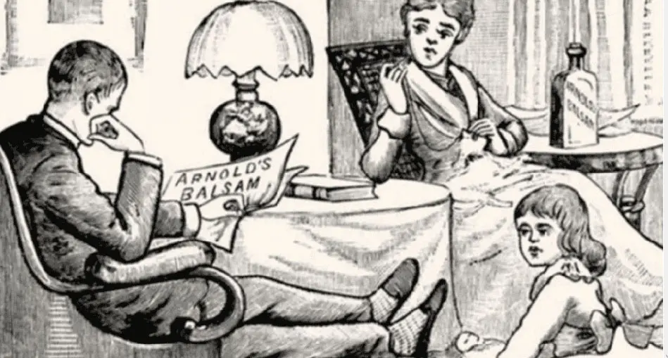 A simple vista se puede ver una escena de una típica familia. La madre cociendo algo, el padre leyendo el diario y la niña jugando con una muñeca. Al rededor de las personas se pueden encontrar distintos objetos de una sala de estar o living de una casa.