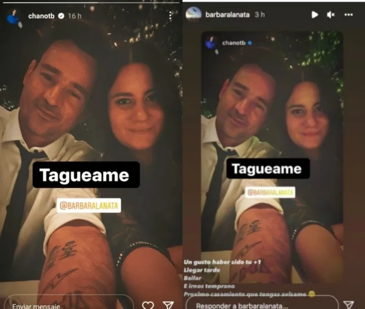 El primero en publicar una foto juntos fue Chano, donde se lo ve sentado muy cerca de ella, con el pedido: "Tagueame". Luego, ella replicó la selfie en sus historias y agregó una dulce declaración: "Un gusto haber sido tu +1. Llegar tarde. Bailar. E irnos temprano. Próximo casamiento que tengas avisame".