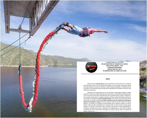 Asimismo, señalaron que “la soga elástica con la cual se realizó el salto Bungee Jumping en ningún momento se cortó y que ningún elemento que se utilizó para su realización presenta desperfecto”.