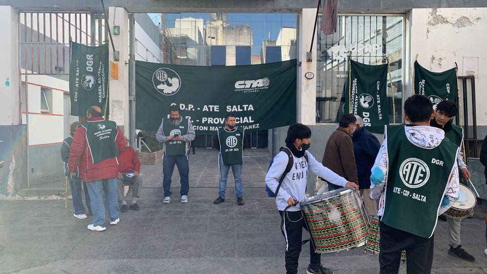 Con trompetas, bombos, banderas, y media calzada cortada, esta mañana trabajadores de la Dirección General de Rentas se manifestaron en la sede ubicada en Caseros 670.