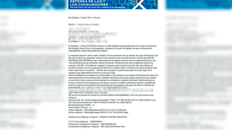 En diálogo con TN el damnificado contó: “La máquina empezó a sonar cuando gané. Se acercó uno de los chicos que estaba en el salón, me felicitó y me dijo ‘ya vuelvo que te tengo que tomar los datos’. Al ratito volvió y cuando estaba anotando mis datos, apareció la encargada y le preguntó qué estaba haciendo. El chico le contó y la mujer dijo que no me iban a pagar el premio porque la máquina tenía un desperfecto”.