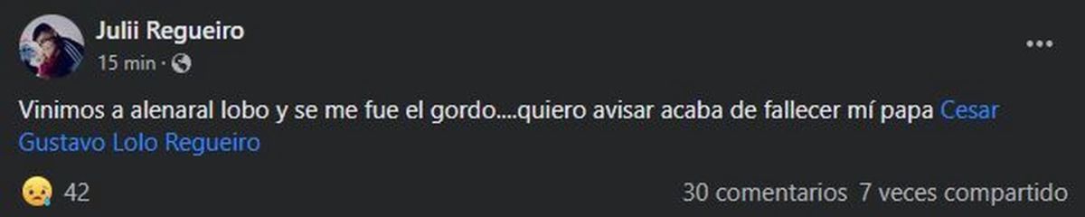 La noticia la confirmó Sergio Berni a TN y luego la reconfirmó la hija del hincha fallecido a través de sus redes sociales: “Vinimos a alentar lobo y se me fue el gordo. Quiero avisar acaba de fallecer mi papa”, escribió Juliana Regueiro en su facebook.