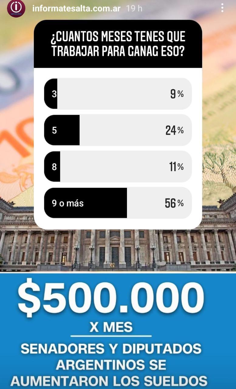 Justamente y buscando estas opiniones, InformateSalta acudió a sus lectores, amigos y seguidores en las redes sociales para obtener sus miradas del incremento en el Congreso. Primeramente y consultados a través de nuestro perfil en Instagram, quisimos saber cuántos meses necesitan para, con sus salarios, alcanzar el mismo monto que percibirán los legisladores mensualmente.