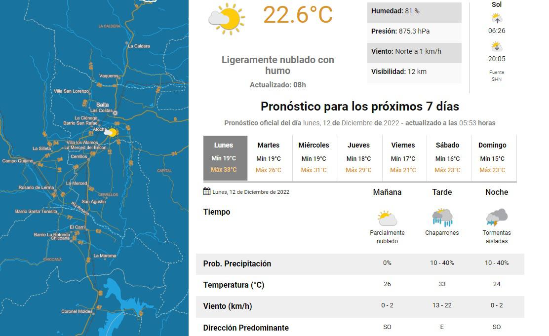 Así lo anticipa el Servicio Meteorológico Nacional. La semana comenzó con un lunes caluroso, para hoy se espera una temperatura máxima de 33°C. Rige una alerta por tormentas para Cachi, Cafayate, Chicoana, La Caldera, La Poma., Molinos, Rosario de Lerma, San Carlos.