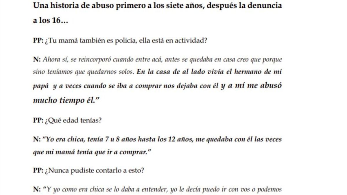 Por su lado, de la pericia de Alicia Castro se desprenden el abuso infantil intrafamiliar por parte de su tío paterno entre los 7 y 12 años.
