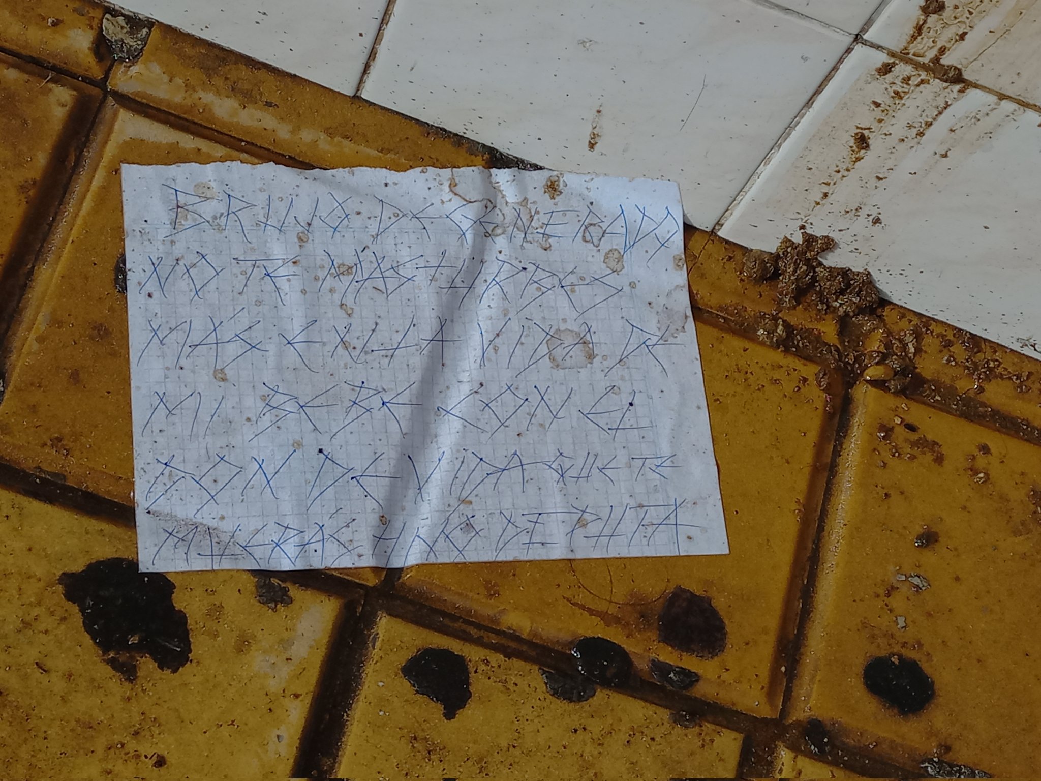 En las imágenes que compartió, se puede ver cómo los restos de materia fecal dibujaban una curva en los cerámicos, ilustrando una postal más que desagradable. Sin embargo a esto había que agregar una nota escrita en un pedazo de hoja cuadriculada, con un mensaje escrito en una especie de código, con letras diamantinas para desviar cualquier sospecha del autor.