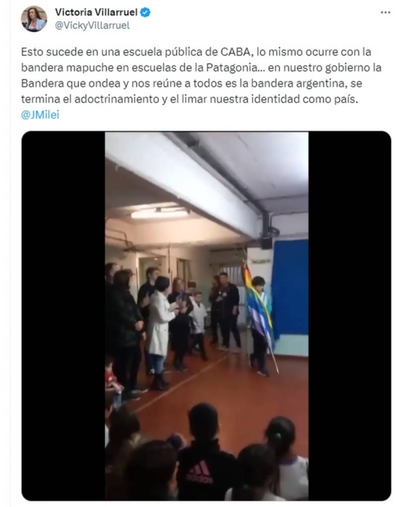 "Esto sucede en una escuela pública de CABA, lo mismo ocurre con la bandera mapuche en escuelas de la Patagonia", escribió la compañera de fórmula de Javier Milei en la red social X (ex Twitter), acompañando el texto con un video en cuestión.