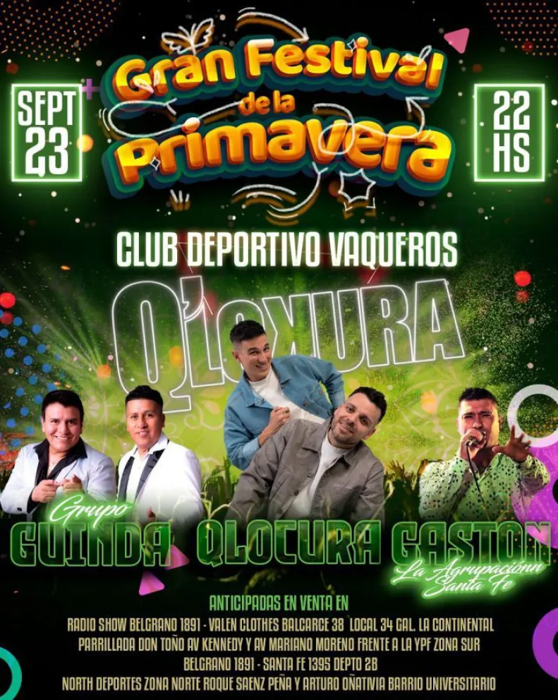 Para los jóvenes que prefieran la música, este sábado 23 será el "Gran Festival de la Primavera" en el Club Deportivo de Vaqueros, donde de una nutrida cartelera sobresalen los grupos Q'Locura, Grupo Guinda y Gastón con la Agrupación Santa Fe. Las entradas ya están a la venta.