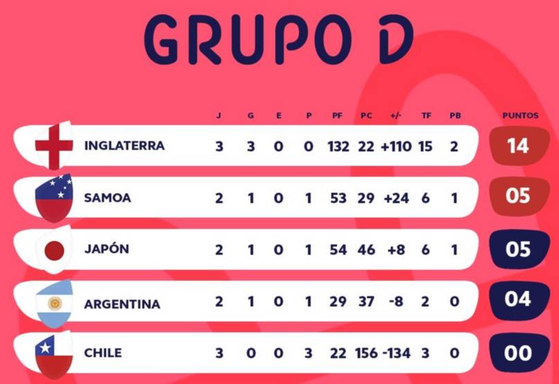 Hasta el momento Japón derrotó a Chile 42-12 y perdió frente a Inglaterra 34-12, mientras que Samoa también venció a Chile (43-10) y cayó con Argentina (19-10).
