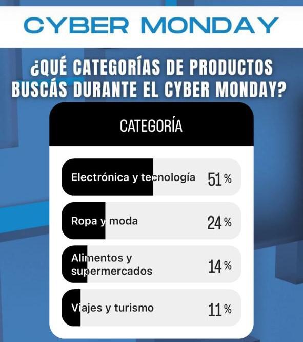 Más del 50% de los consultados se mostró deseoso de aprovechar los descuentos en dispositivos electrónicos, gadgets y productos tecnológicos en general. En tanto, “ropa y moda” ocuparon el segundo lugar con un 24%, seguidas de “alimentos y supermercados” con un 14%, y los viajes y turismo con un 11%.