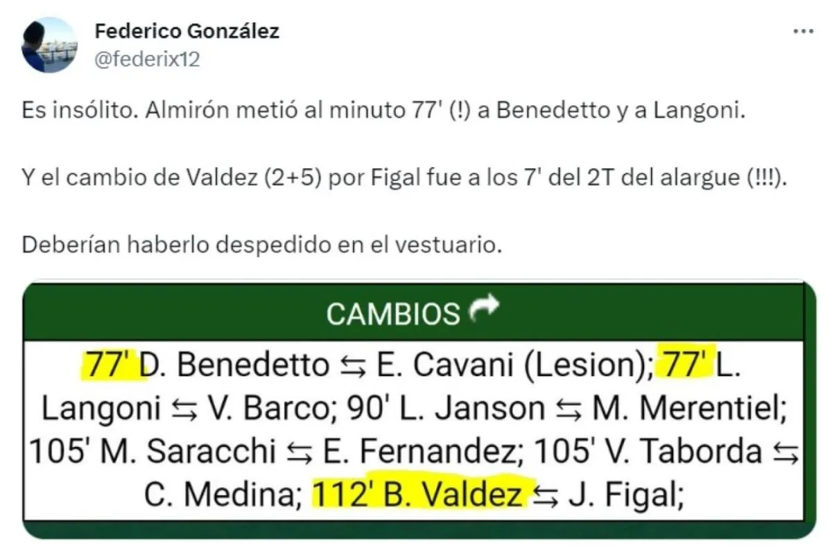 El usuario de la red social X, ex Twitter, disparó la primera bala: "Es insólito. Almirón metió al minuto 77' (!) a Benedetto y a Langoni. Y el cambio de Valdez (2+5) por Figal fue a los 7' del 2T del alargue (!!!). Deberían haberlo despedido en el vestuario".