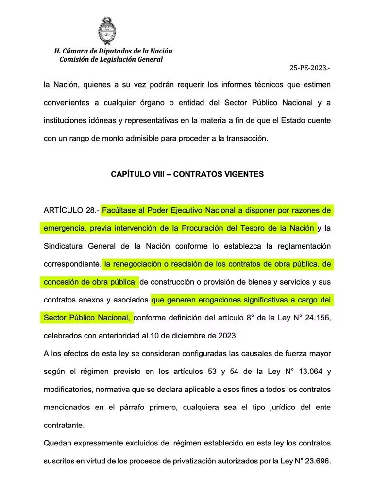 El artículo referido a los Contratos Vigentes tuvo tres modificaciones en relación al original, a pedido de la oposición acuerdista. Por un lado, limitó los contratos sujetos a revisión o rescisión a los que “generen erogaciones significativas a cargo del Sector Público Nacional”, pero sin especificar qué monto se considerará “significativo”.