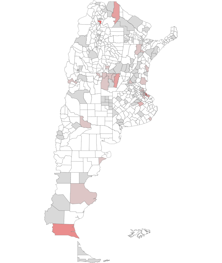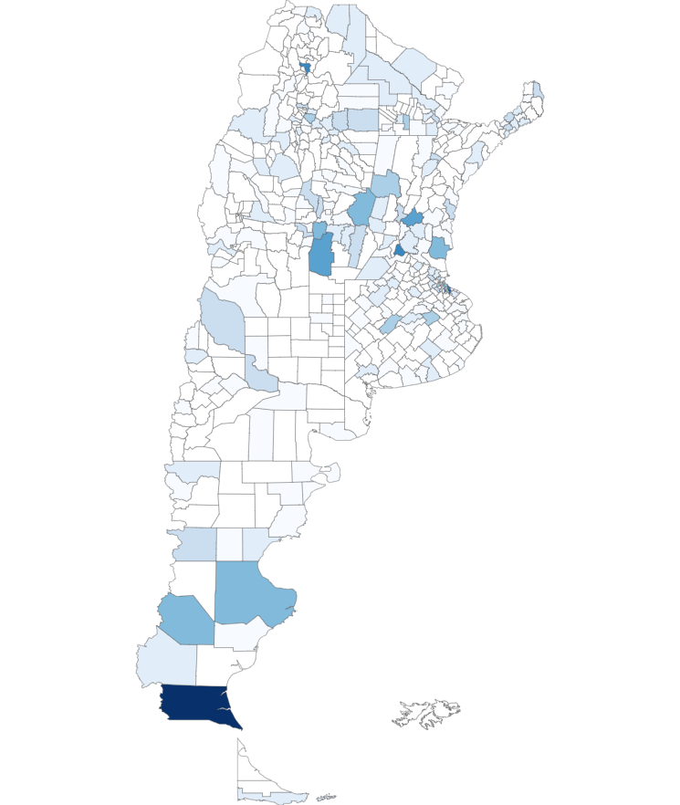 De esa cifra, 132 están ubicadas en la Provincia de Buenos Aires; 36 en Córdoba; 26 en Santa Fe; 25 en Entre Ríos; 24 en Chaco; 23 en Santa Cruz; 22 en Misiones; 21 en Santiago del Estero; 17 en Tucumán; 15 en Salta; 13 en Chubut, 11 en Catamarca. Excepto Córdoba, el resto tenían mandatarios peronistas o aliados hasta el 10 de diciembre.