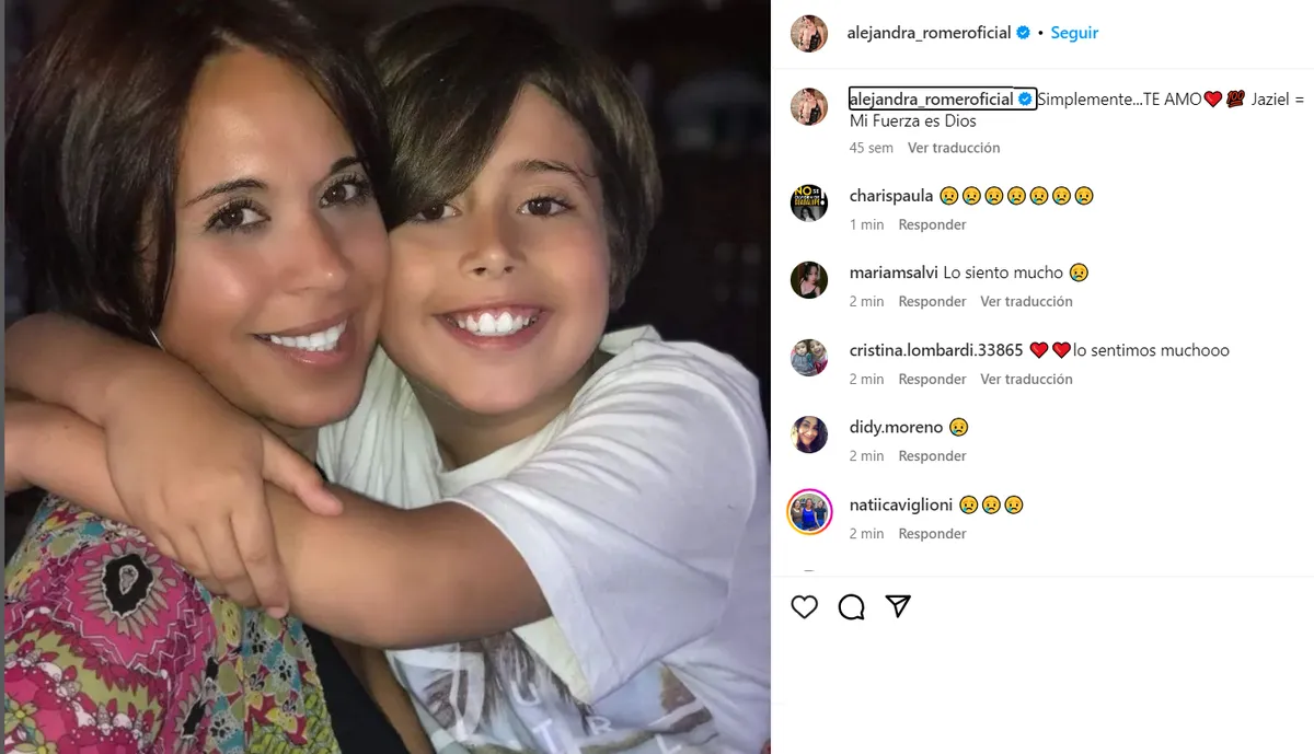 Dentro de su cuenta de Instagram, Alejandra Romero tiene varias fotos junto a su hijo Jaziel, con quien dejó anclada una publicación con él para despedirlo. “Simplemente, te amo. Jaziel=mi fuera es Dios”, escribió debajo del posteo.