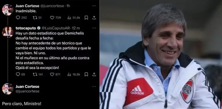 Luego de que River perdiera 1-0 ante Huracán en su visita al Estadio Tomás Adolfo Ducó y Martín Demichelis quede en la mira de muchos hinchas millonarios que vienen criticándolo desde hace meses, se sumó a la polémica el ministro de Economía, Luis Caputo.