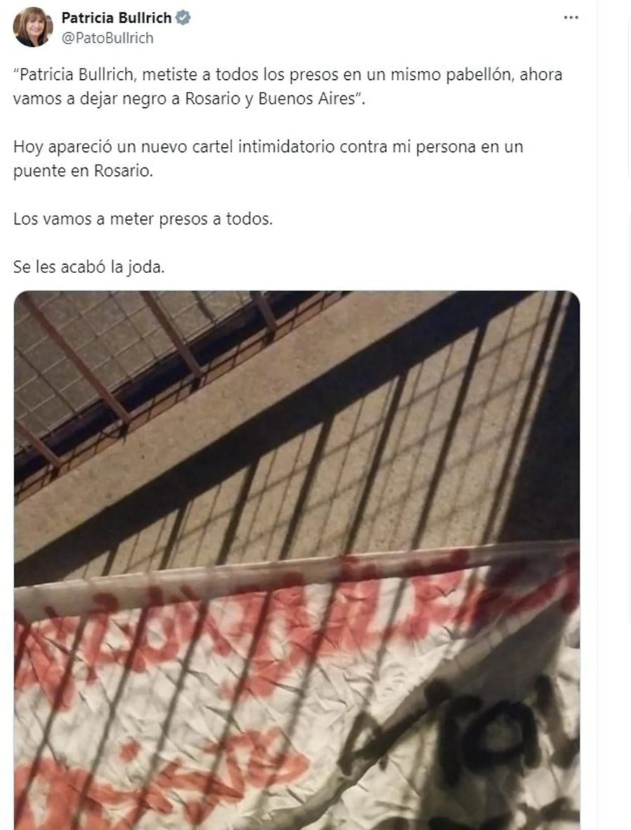 Unas dos semanas atrás ya había aparecido en Rosario un cartel con una grave amenaza contra Bullrich, en un puente de la Avenida Circunvalación, que bordea la ciudad santafesina.
