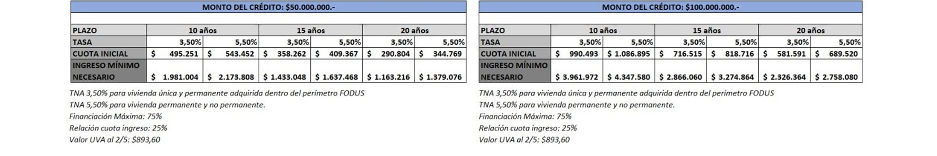 Para tomar un crédito de $50 millones con la línea general (tasa de 5,5% anual más UVA) y se elige un plazo de 10 años, el ingreso familiar necesario asciende a casi $2,2 millones y la cuota inicial a $543.452; si se extiende a 15 años, los ingresos necesarios bajan a $1,6 millones y la cuota 409.367 pesos.