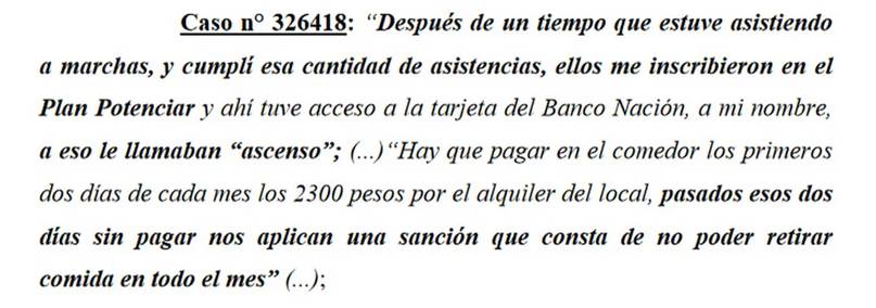 De la investigación se desprende que a los comedores se les debía pagar los primeros dos días de cada mes 2.300 pesos por el alquiler del local. Quienes no lo hacían, no podían retirar la comida de todo el mes.