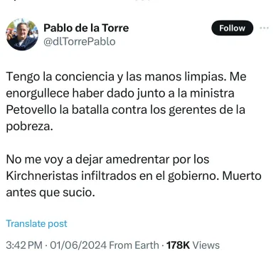“Tengo la conciencia y las manos limpias. Me enorgullece haber dado junto a la ministra (Sandra) Petovello la batalla contra los gerentes de la pobreza”, aseguró De la Torre en redes sociales.