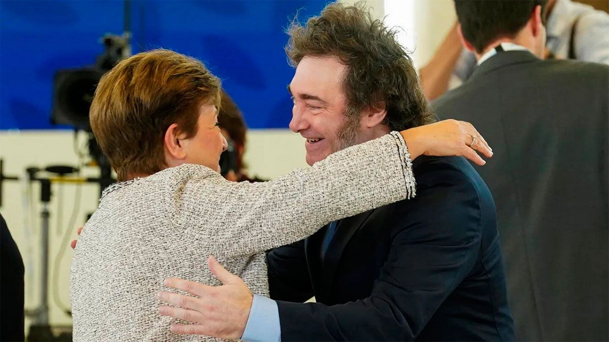 Milei recibe un abrazo de Kristalina Georgieva.