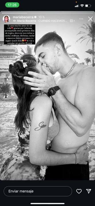 "Te amo mucho amor de mi vida. Gracias por haberme acompañado estos primeros días de gira, ahora te toca volver a casita a trabajar, disfrutar, cuidar a nuestros hijitxs perrunos y a seguir siendo feliz. Te voy a extrañar mi gordito", expresó María Becerra en su publicación, acompañada de una fotografía sensual de la pareja besándose en traje de baño.